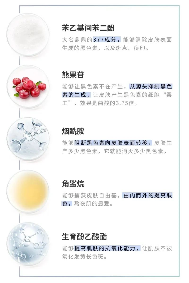 添加的5大珍贵核心成分:377、熊果苷、烟酰胺、角鲨烷、生育酚乙酸酯。