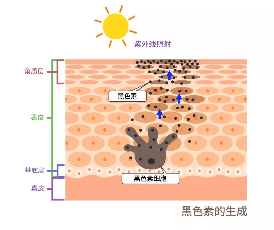 皮肤经过阳光中紫外线的照射,会分泌大量的黑色素,并逐渐向皮肤表面转移,导致肌肤暗沉变黑。