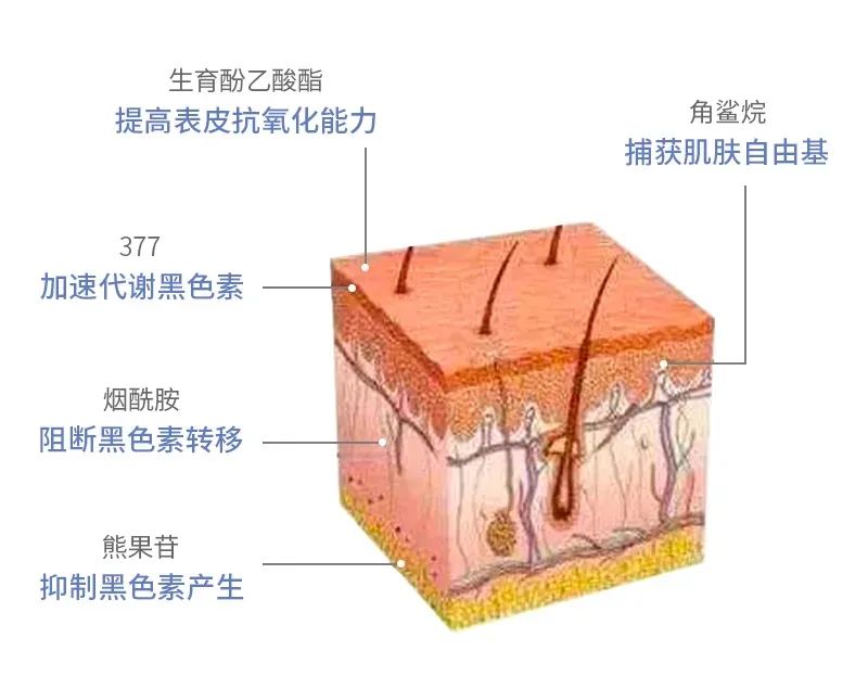 它能快速渗透基底层,从5个维度,全面粉碎黑色素的分泌、转移、代谢。并起到很好的抗氧化、清除自由基作用。