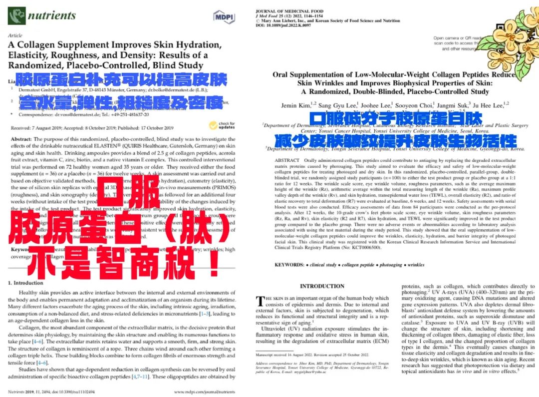 ②韩国延世大学的学者也通过随机,双盲的临床实验同样证明了,口服低分子胶原蛋白肽可以有效减少皮肤光老化所引起的皮肤皱*纹。