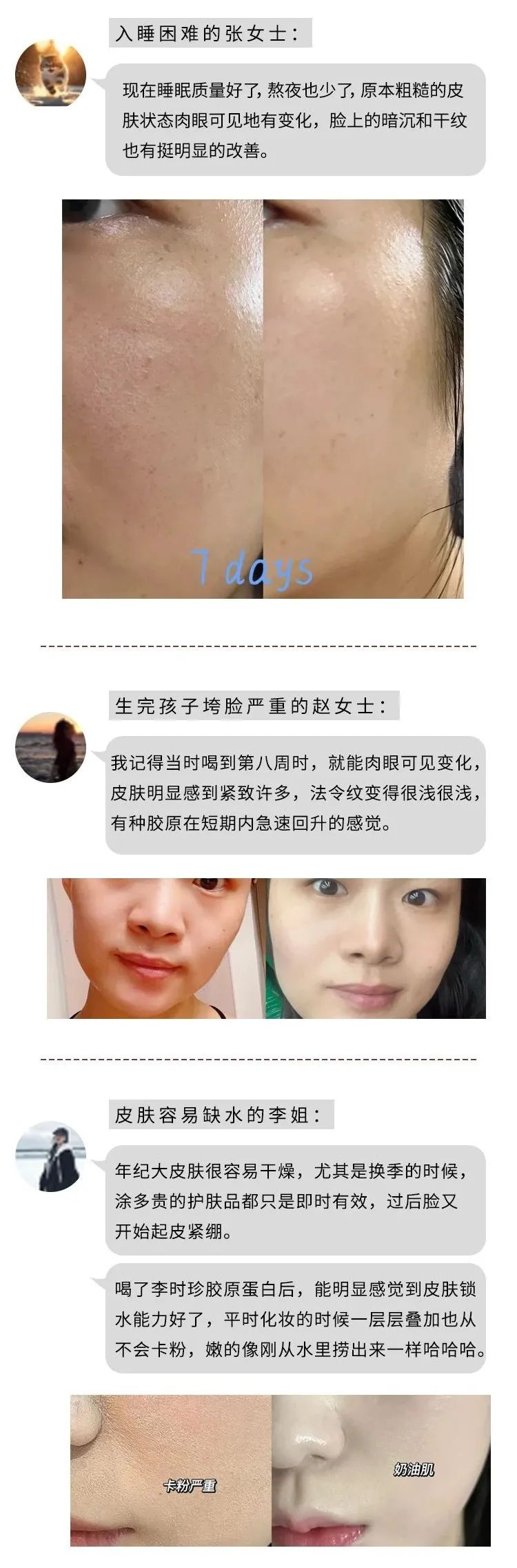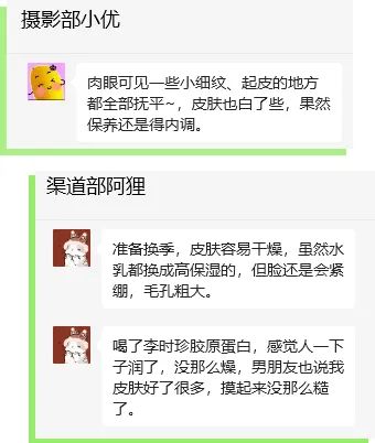宝妈同事生完孩子后皮肤一直爆痘/暗沉,喝了一段时间后,大家都能发现她素颜看上去白净了许多,有个客户还悄咪咪夸她皮肤好。