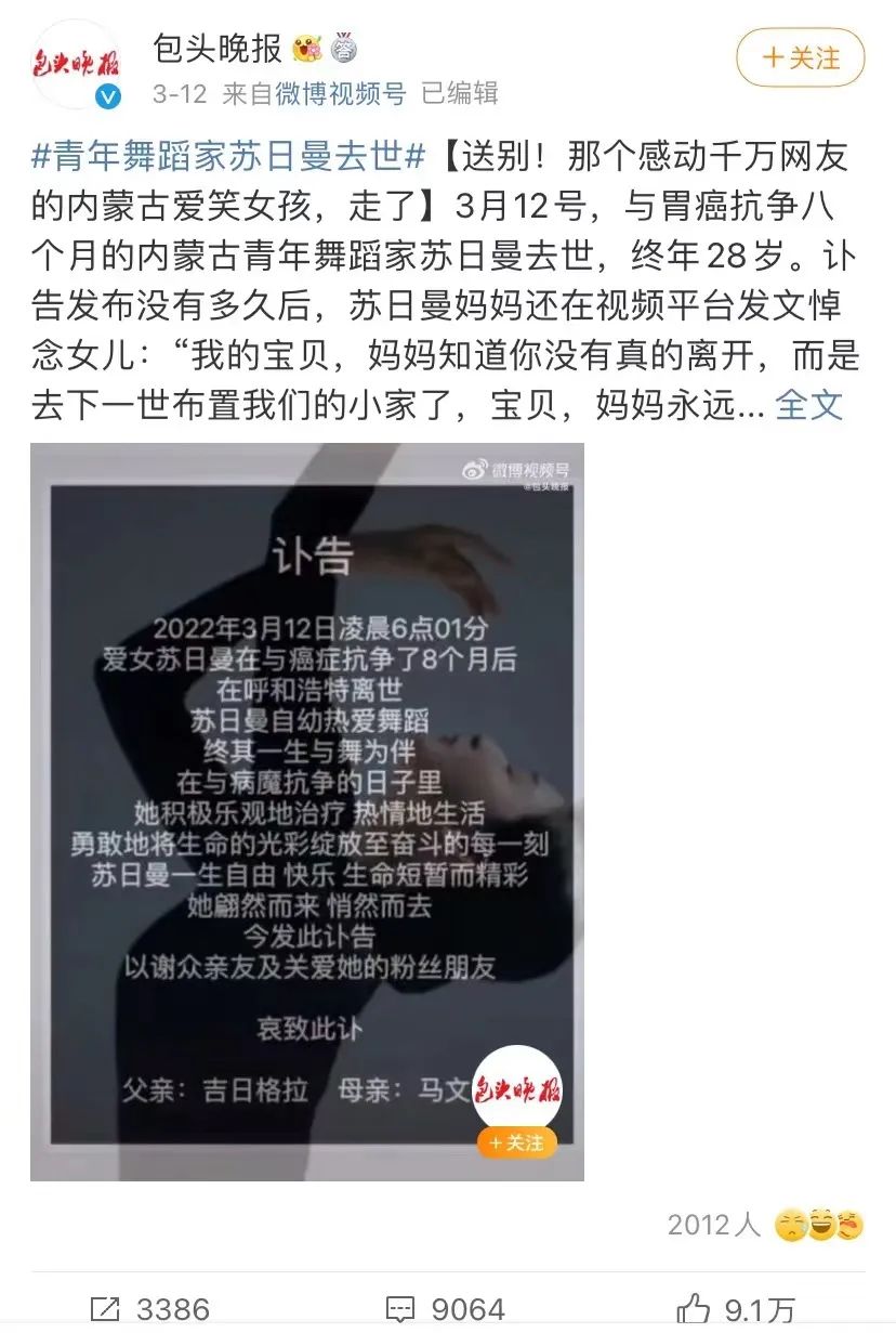 上个月,28岁的年轻舞蹈家苏日曼胃癌去世,引发网友热议。