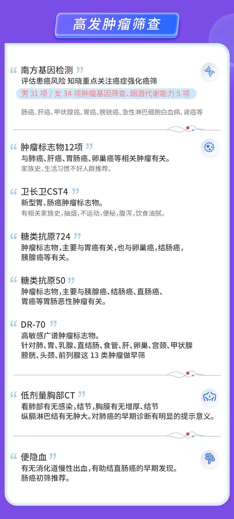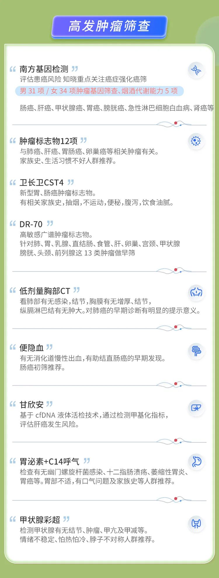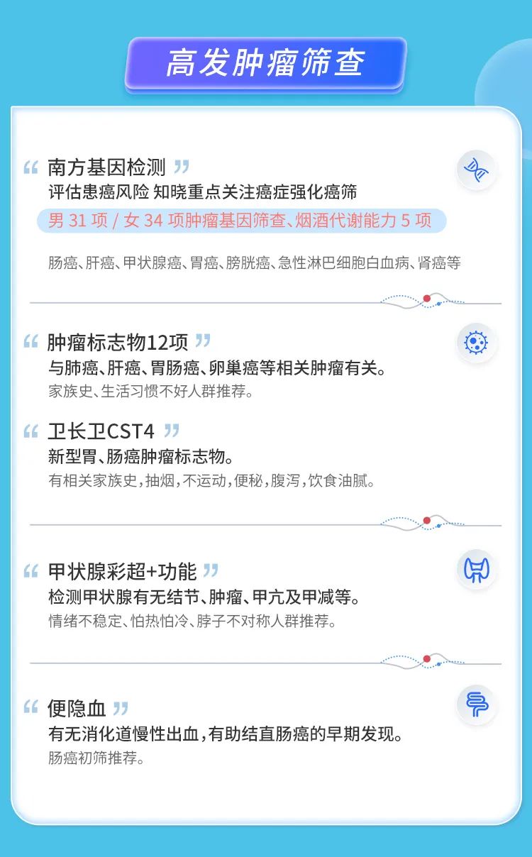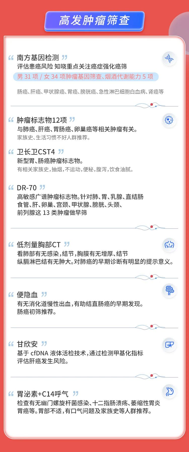 爱康集团-防癌先锋全面卡体检,针对结直肠癌、宫颈癌、乳腺癌、肺癌、肝癌、膀胱癌、胃癌、甲状腺癌等多种癌症,升级基因检测、肿瘤标志物、卫长卫、DR-70、胸部CT、便隐血、甘欣安、胃泌素、C14、甲状腺彩超+甲功等多项特色癌筛项目,是一款针对全身肿瘤全面筛查的专项特色套餐。