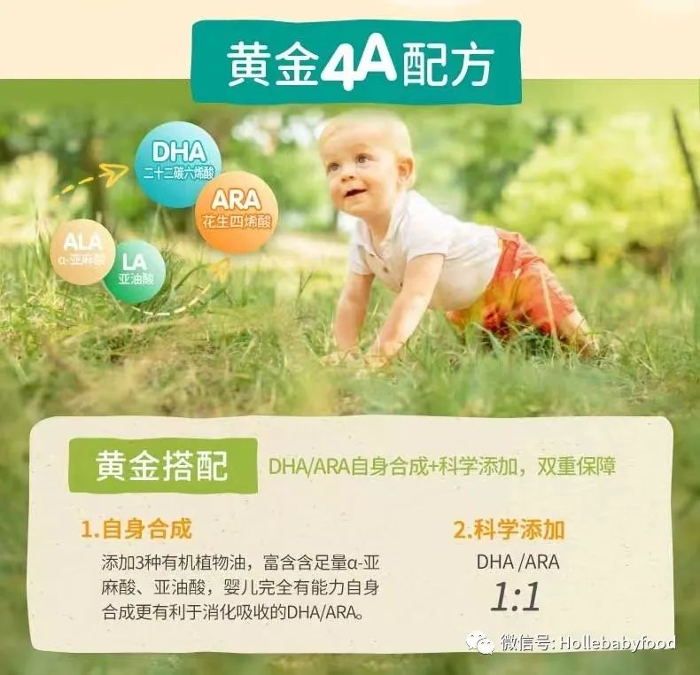 2、独特黄金4A配方,双重保障,将家长们关注的DHA,ARA,ALA,LA这些脑眼发育的关键成分科学添加,同时也让宝宝自身能合成,双重保障,呵护宝宝健康成长每一步
