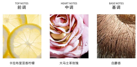 闻起来像玫瑰在花园中热烈绽放,混合清新的茉莉香。两种香味碰撞在一起,再加上花木麝香香调的平衡,融合出持久的魅力香气。