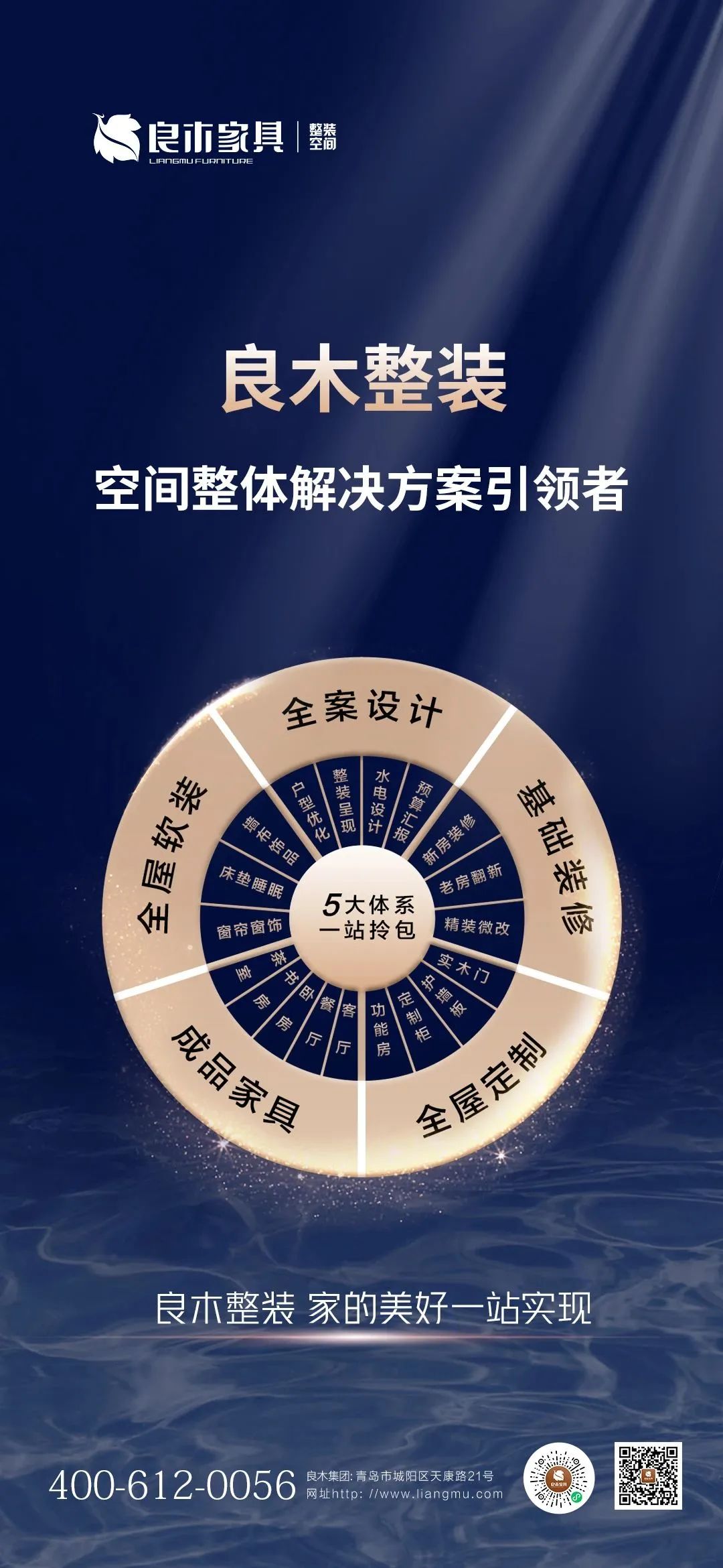 以全案设计、基础装修、全屋定制、成品家具、全屋软装5大服务体系为您打造“一站式美好家”。