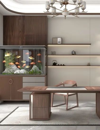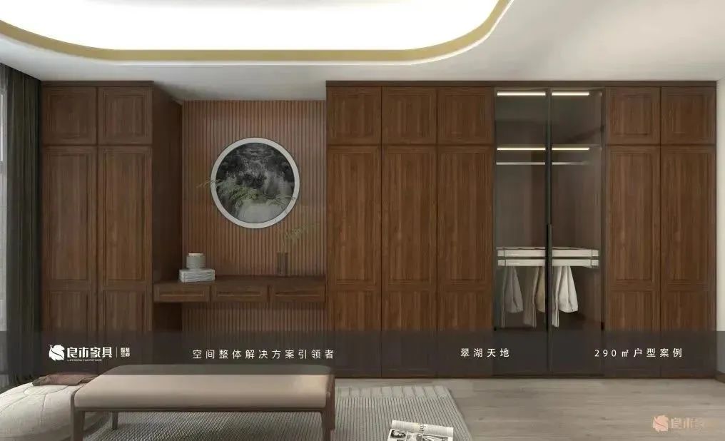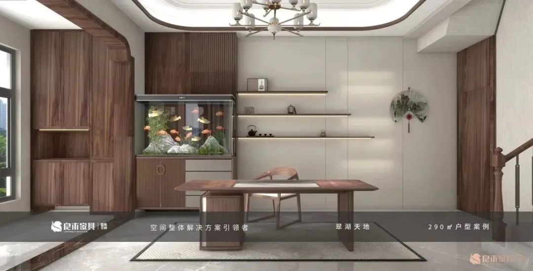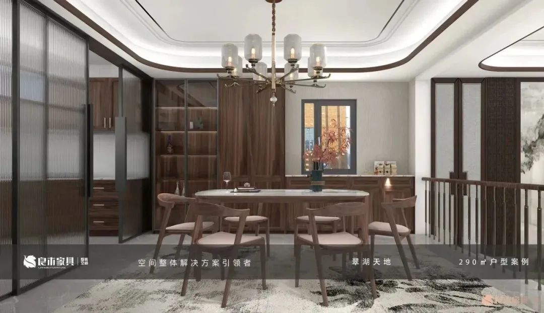 在设计上突破传统中式过于厚重的诟病,融合金属、玻门、感应灯带元素,展现优雅而低调的东方之美;