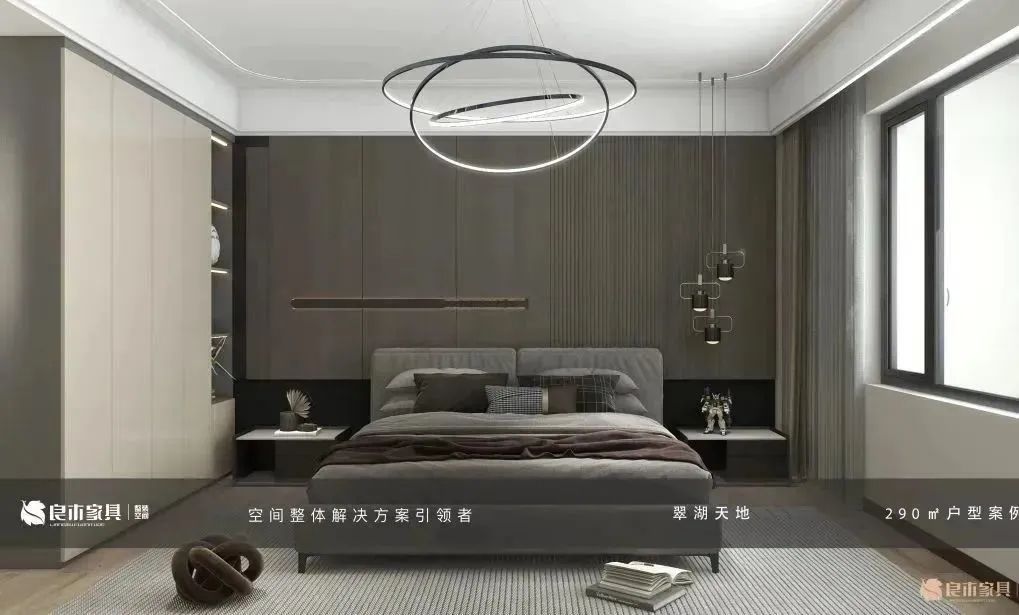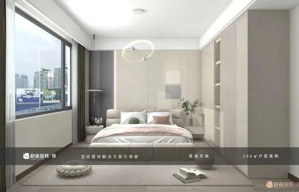 卧室整体采用低饱和度奶油色,衣柜、护墙板、床体、地板、地毯色调协调统一。