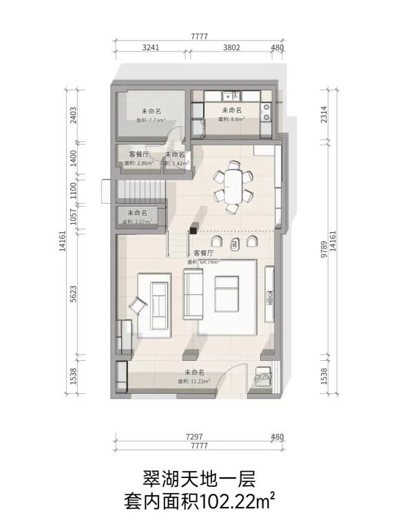 通过楼梯将客厅与餐厨区域区分开来,