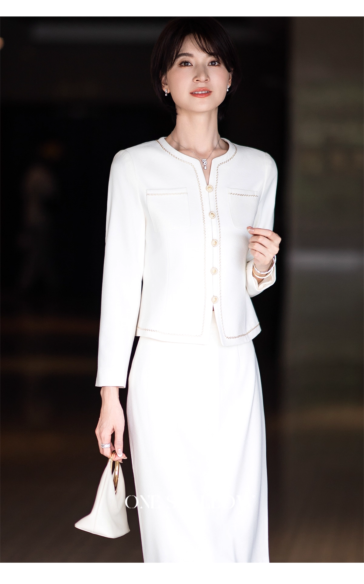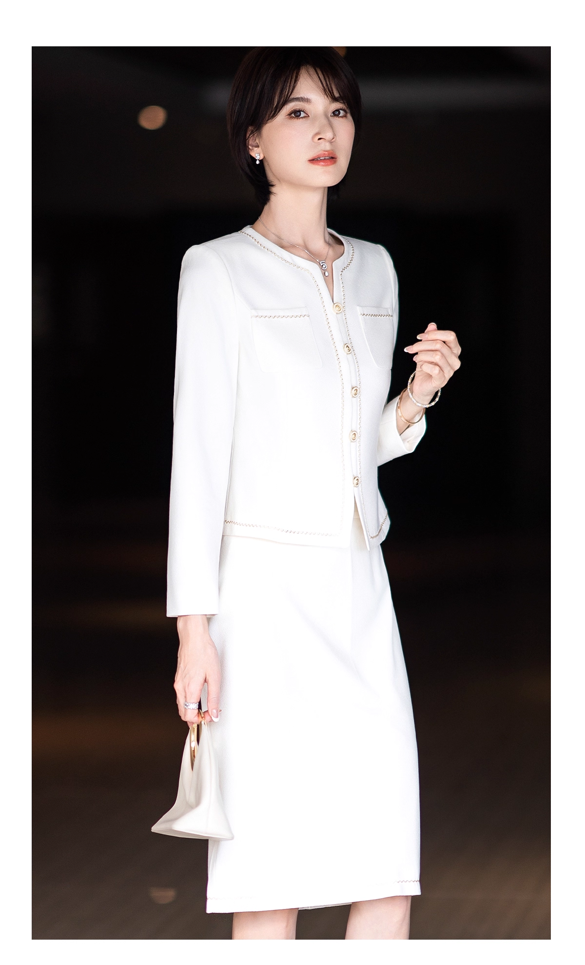 搭配的圆环手包更是点睛之笔,与金属纽扣、首饰相呼应,让整体造型精致感拉满。不管是作为职场通勤装,还是出席正式场合的礼服,它都能完美驾驭