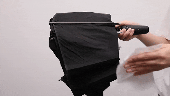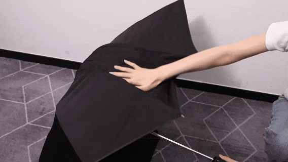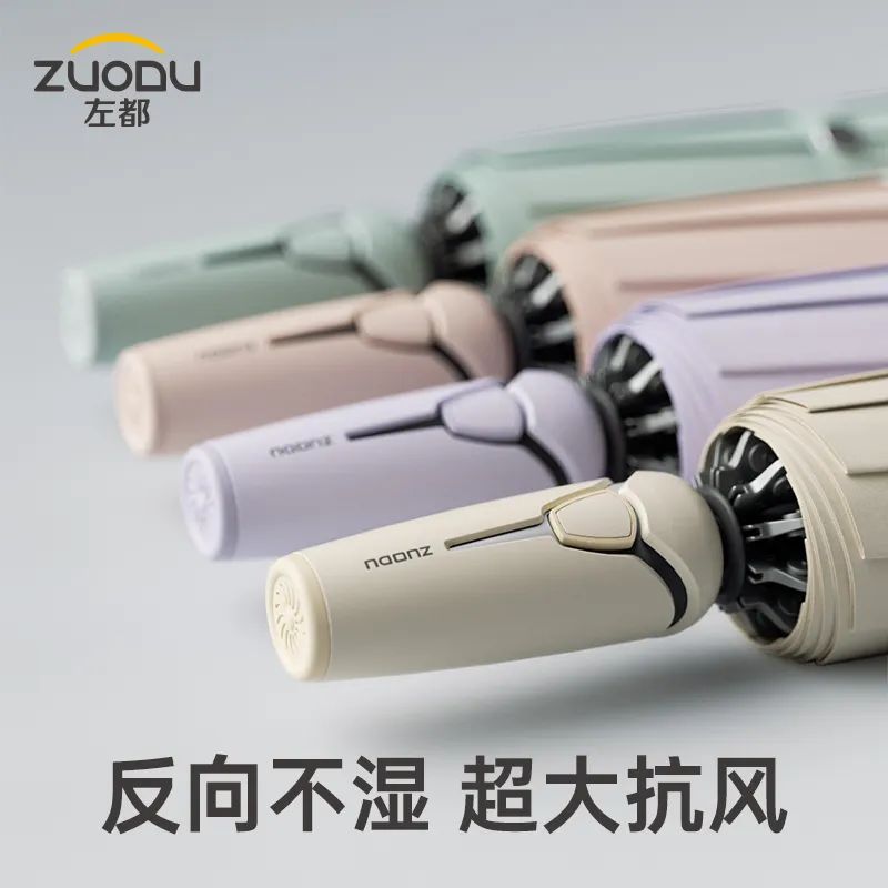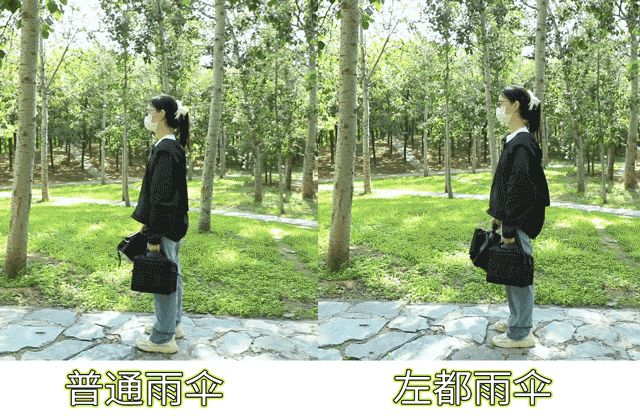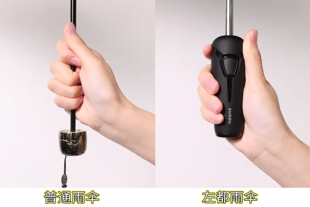左都设计出反向收伞,湿面朝里,干面在外,牢牢包裹住雨水。