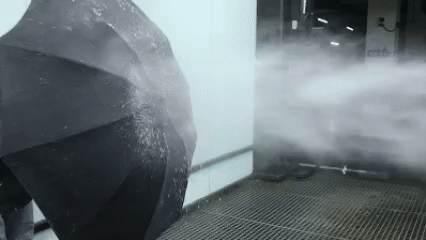 用高压水枪模拟暴风雨,普通雨伞根本扛不住,里布直接渗水。