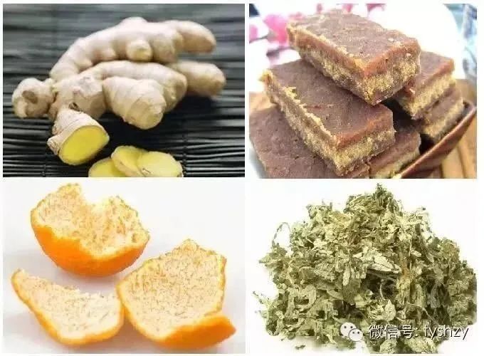 生姜1片,桔子皮四分之一个,小块红糖(约5克),艾叶3克。