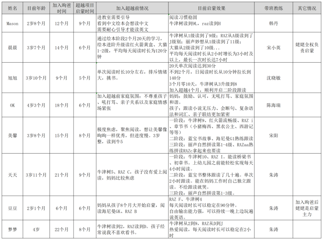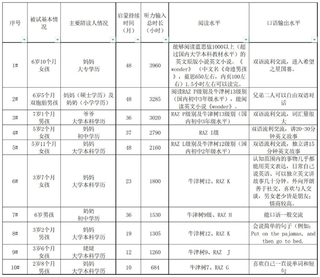 这一年里,我们成立了昫爸亲子阅读研究中心,作为一个科研性质的单位,公司已经开始与一些科研院所合作,力争在育儿实践领域取得更多有价值的科研成果。未来中心将会有越来越多的科研论文在高水平的科研期刊上发表。下表是我们精选的10个家庭输入数据和孩子的启蒙效果梳理总结。通过表格可以清晰看出,很多孩子经历了在昫爸1-4年的持续启蒙,都达到了非常优异的启蒙效果。