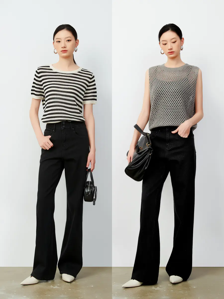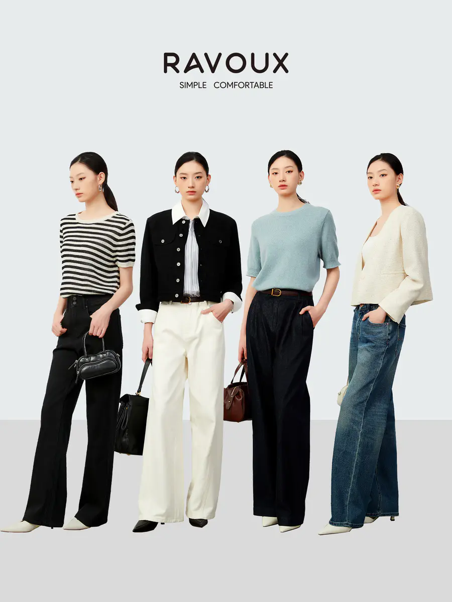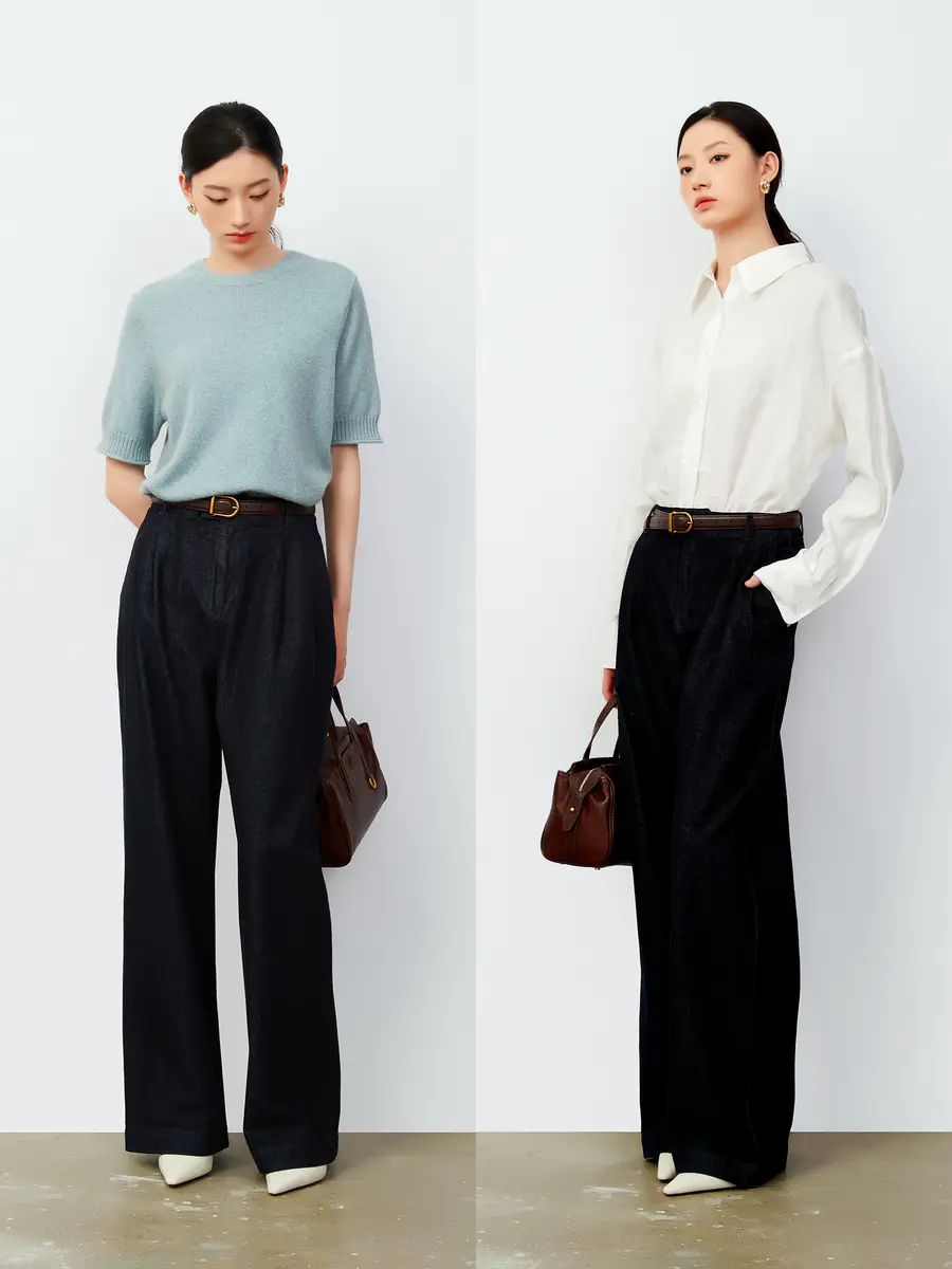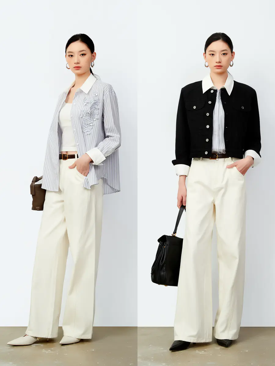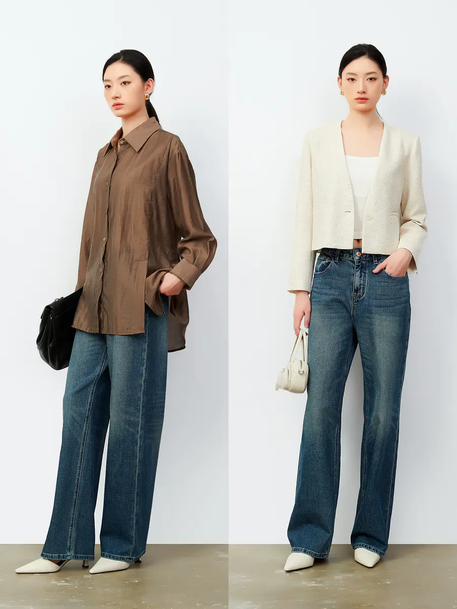 3️⃣原色阔腿牛仔裤,硬挺线条