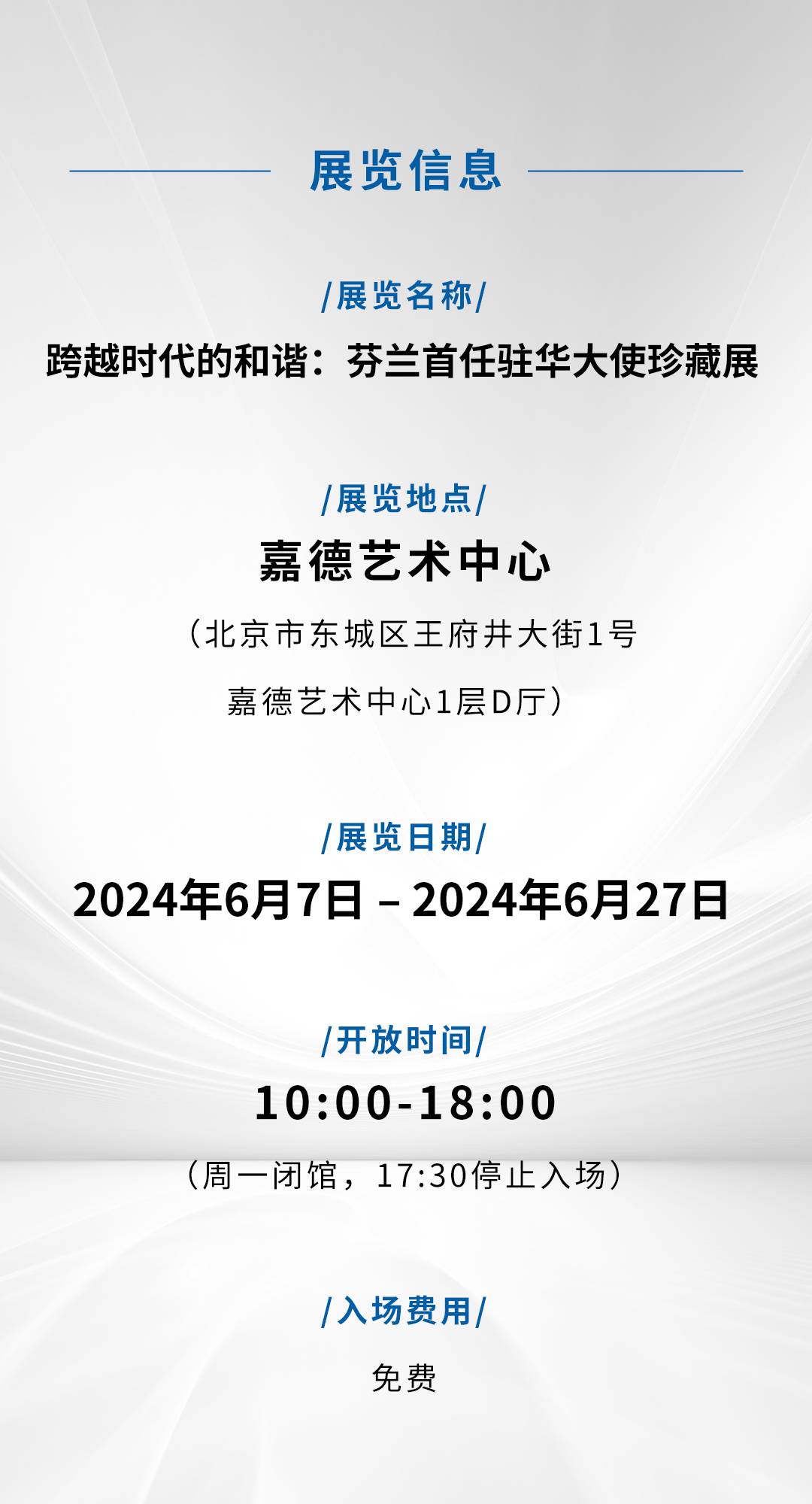 嘉德艺术中心与芬兰驻华大使馆荣幸地宣布“跨越时代的和谐:芬兰首任驻华大使珍藏展”于2024年6月6日在嘉德艺术中心开幕。6月7日至6月27日期间,展览向公众免费开放。