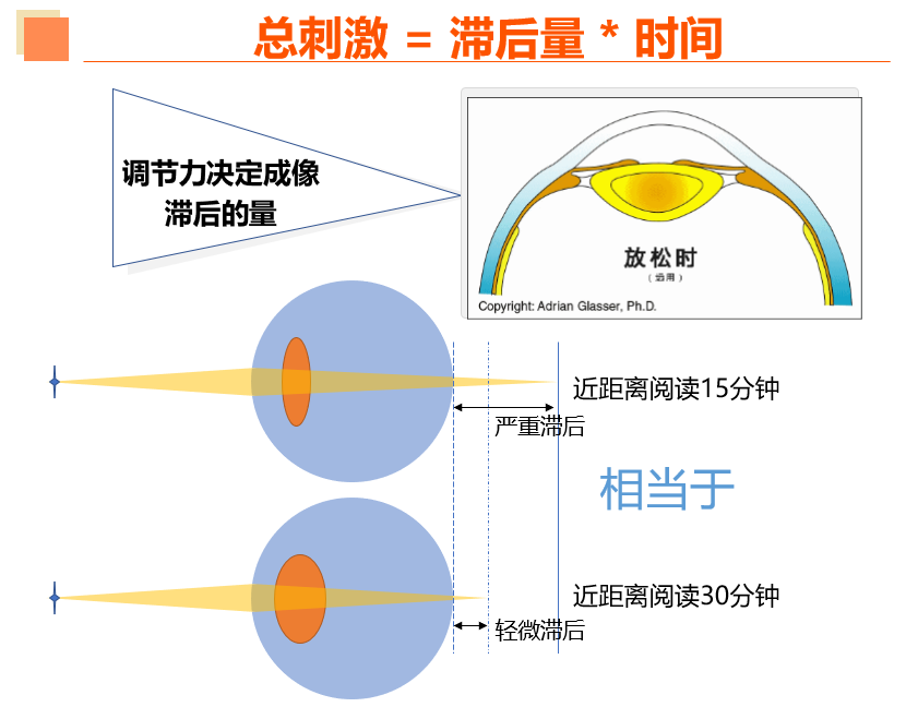 不同的阅读距离,需要的调节力和人眼实际作用的调节力之间是有差别的,也就是调节滞后。可以看到,用眼距离越近,调节滞后就越大。用眼距离为10厘米的时候,需要的调节力相对较大。用眼距离越远,调节滞后就越小。影响调节滞后的因素,除了阅读距离之外,本身的调节力也是至关重要的。这就是我们强调减少近距离阅读的原因。而调节力之所以成为近距离阅读时对近视发展刺激的一个重要的因素,用数学公式来表达就是:总刺激量=滞后量ⅹ时间。