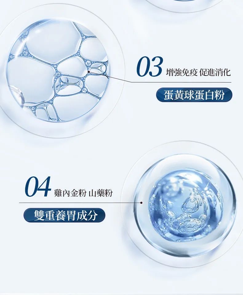除了靠益生菌调节肠胃菌群平衡外,里面还添加了蛋黄球蛋白+乳铁蛋白!