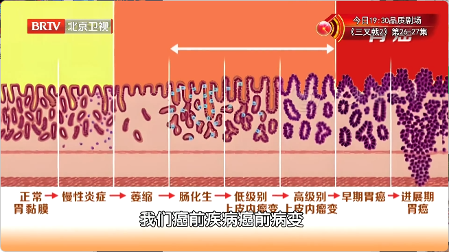 在胃癌真正找上门之前,往往会经过慢性浅表性胃炎→慢性萎缩性胃炎→肠上皮化生→上皮内瘤变4个过程。