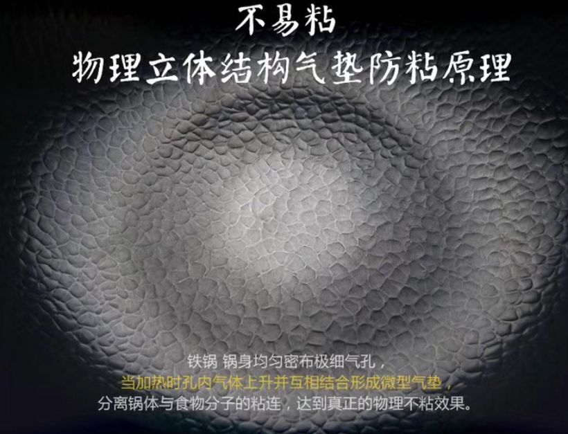 从物理原理上分析,就是「蜂巢构造」通过锅身均匀密布的细孔道,加热室孔内气体上升形成微型气囊来阻隔锅体和食物分子的黏连。