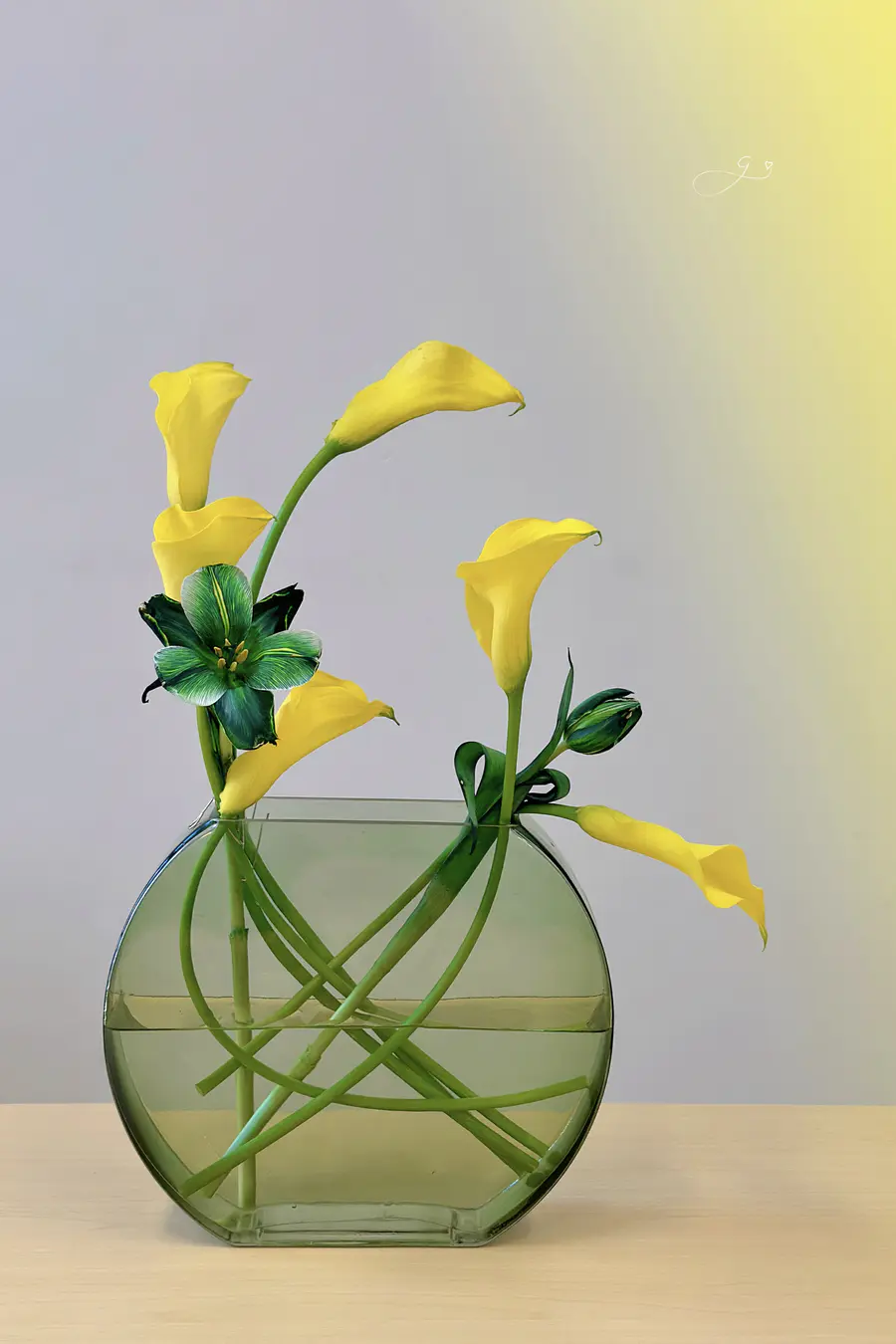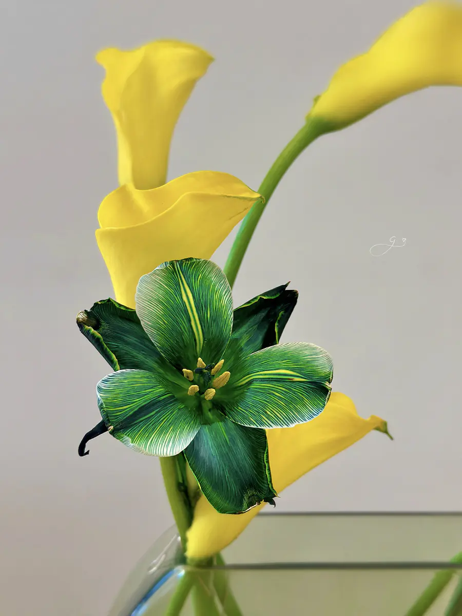 来自荷兰进口的柠檬黄马蹄莲,搭配着油画绿的郁金香,光影交错~