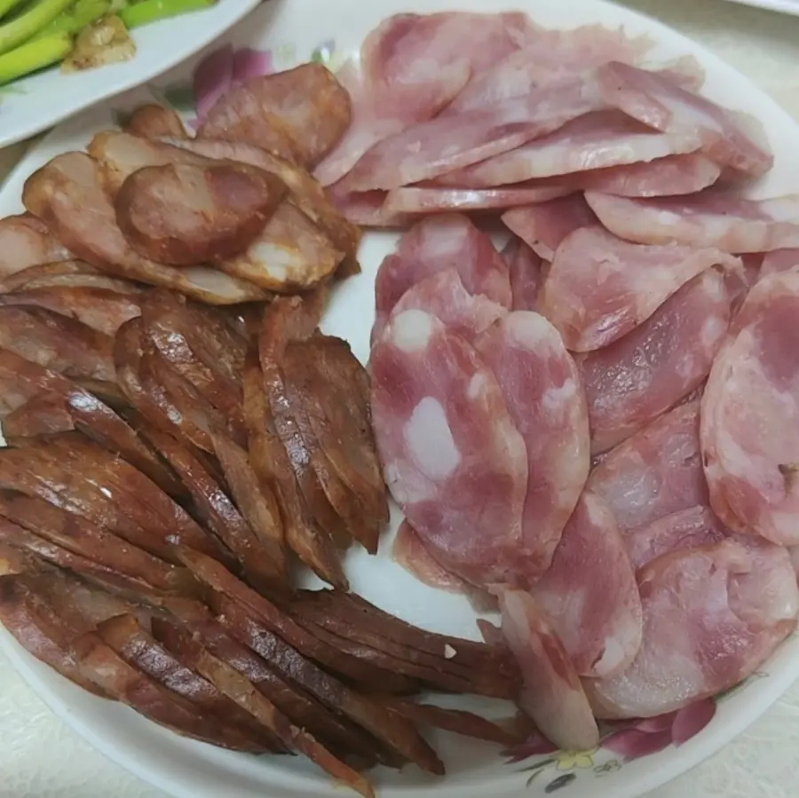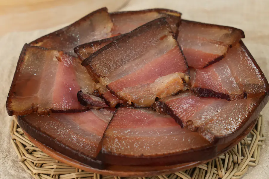 煮熟的腊肉切成薄薄的一片夹起来向光一看,肥肉部分晶莹剔透,吃起来肥而不腻。瘦肉部分红润诱人,在嘴里细细咀嚼,早已腌入肌理的香料一丝丝渗透出来,香味充盈口腔,极其可口