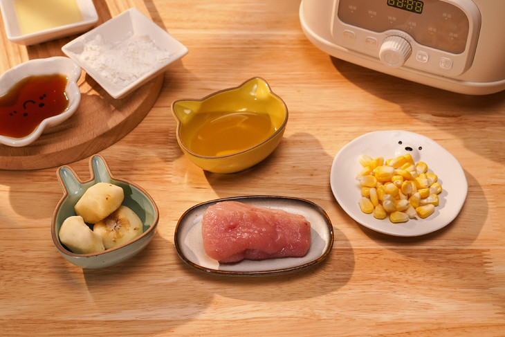 1、猪肉、马蹄切碎,加入玉米粒、玉米淀粉、宝宝酱油、姜葱水和辅食油搅拌均匀。