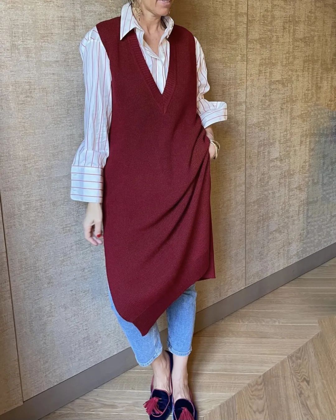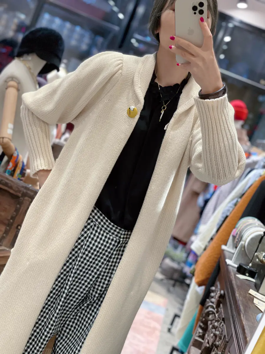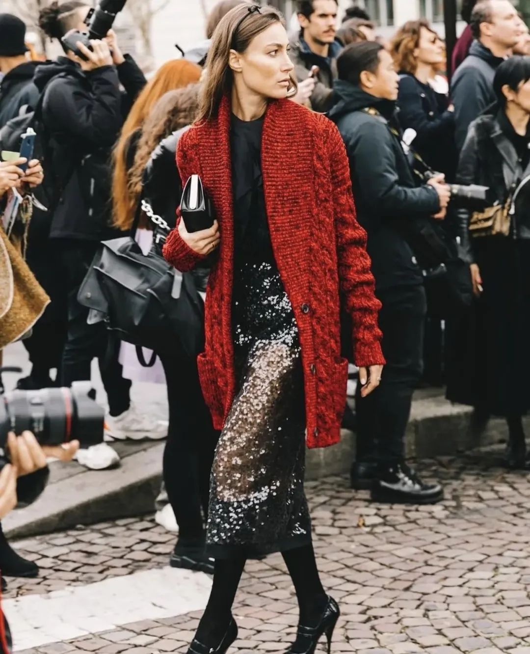 长款开衫毛衣搭配鲜亮颜色的单品,用色彩的跳跃度来击破沉闷。