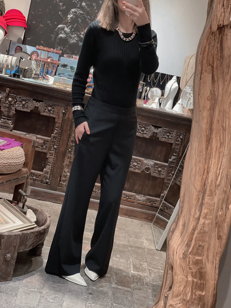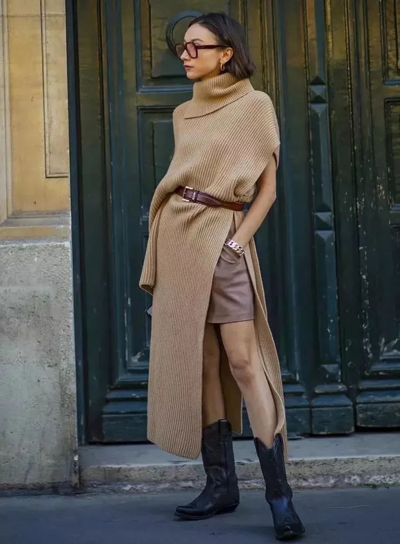 比较贴身的毛衣,塞局部到腰间,颠覆我们对于毛衣习以为常的中庸造型感。