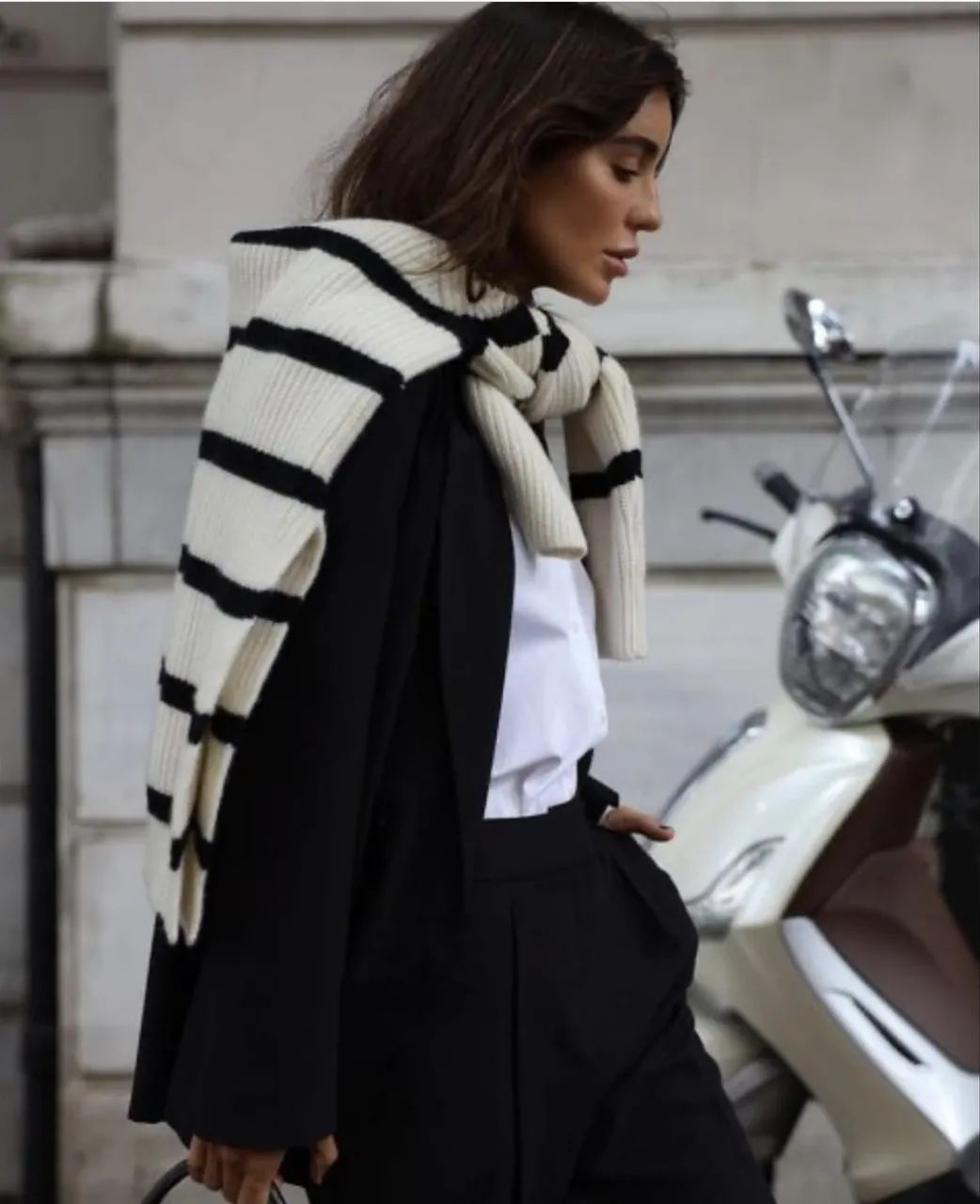 把大毛衣当大披肩,看似随意的搭在肩膀,其实又时髦又保暖,进到室内脱下也不会像脱套头衫那么尴尬。