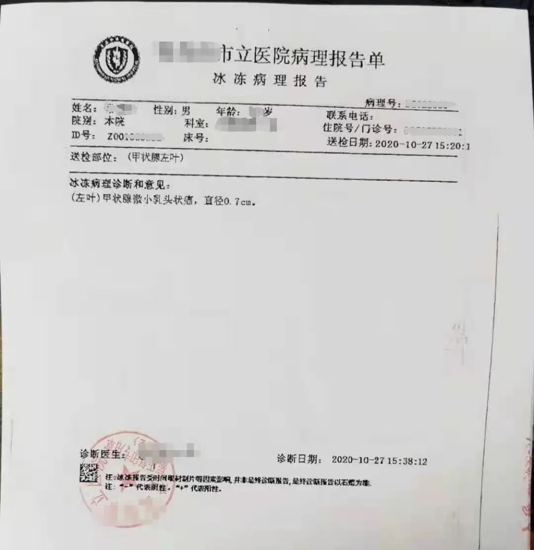 后面的体检项目是怎么做完的,我已经完全没印象了,只记得走出体检中心大门后,我立刻去了青岛市立医院,经过一番检查后,大夫告诉我说:“确诊为恶性甲状腺癌早期,没有出现转移,建议直接切除。”真的是癌,庆幸的是处于早期。