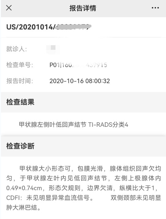 坐起身来,看到医生严肃的表情,我感觉到情况可能更糟。果然,医生告诉我,“彩超发现异常——甲状腺左侧叶见边界欠清晰的低回声结节,大小约5.7×6.4毫米,纵横比>1,考虑恶性结节的可能性比较大,建议你尽早到三甲医院做进一步检查。”经常和各种肿瘤产品打交道的我,听完体检医生的话,心里咯噔一下,大脑瞬间空白,心里反复念叨的就是“我怎么会得了癌?”