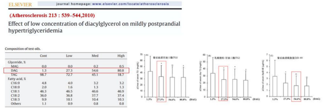 2010年荷兰阿姆斯特丹国际医学核心期刊《爱思唯尔》发表文献数据,实验结果显示,当食用油的甘油二酯含量>27.3%,长期食用对人体健康及其明显调节的作用,甘油二酯在减少内脏脂肪、抑制体重增加、降血脂等方面有重要功能。