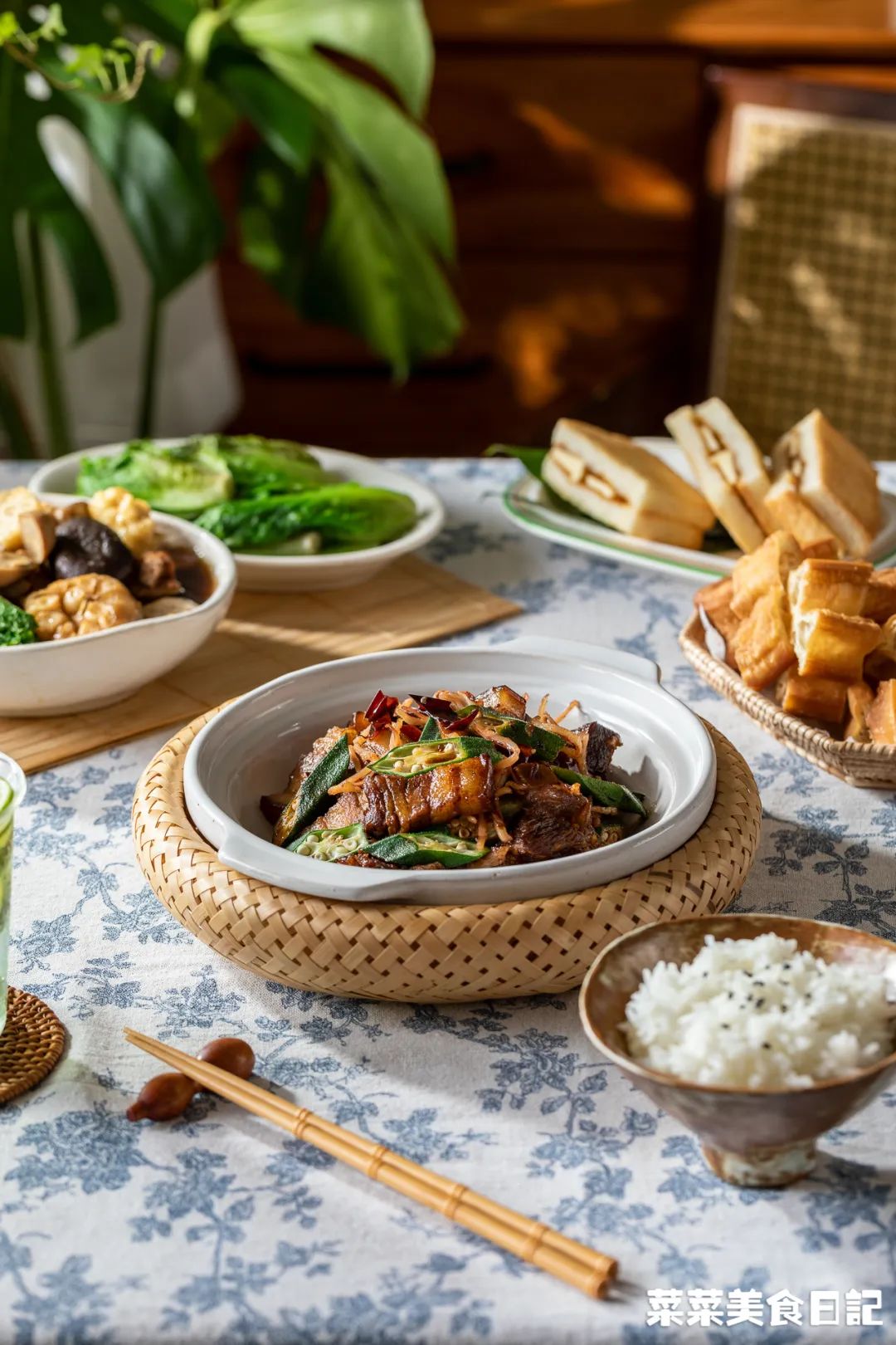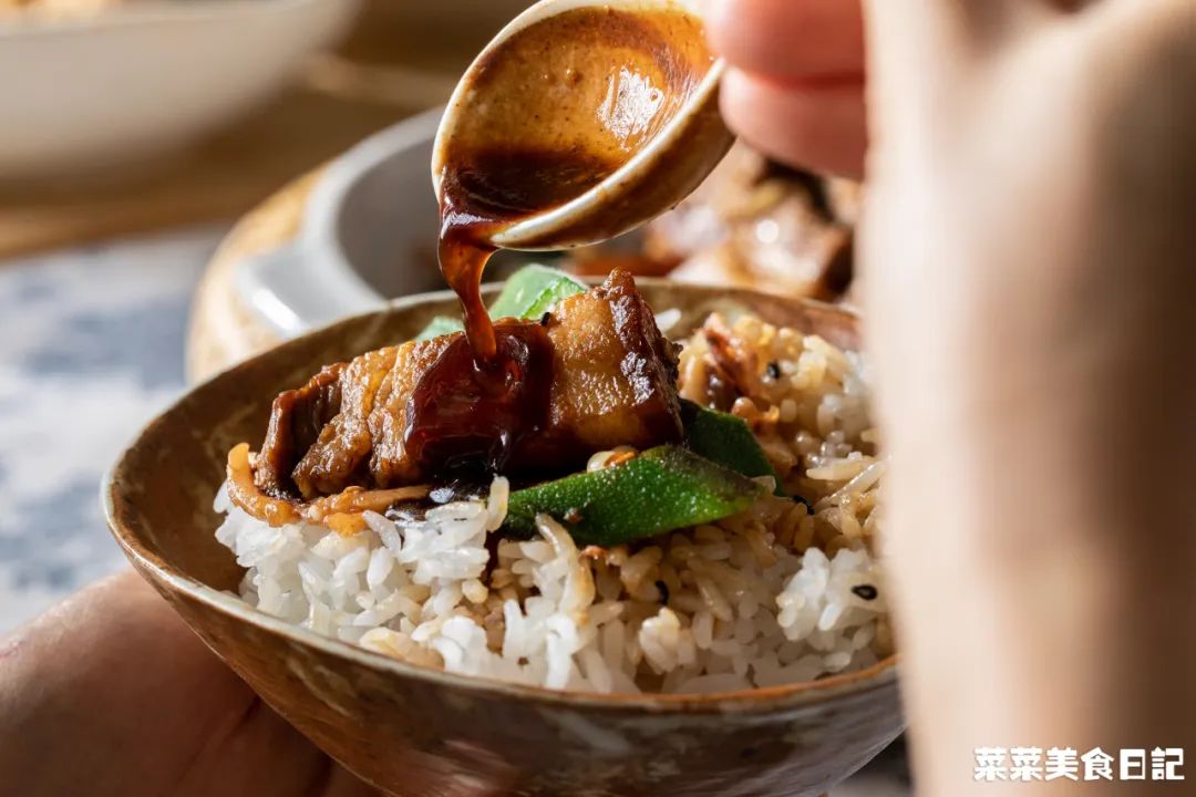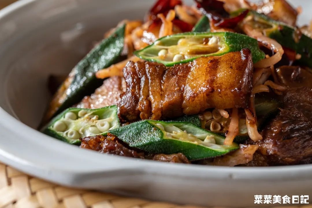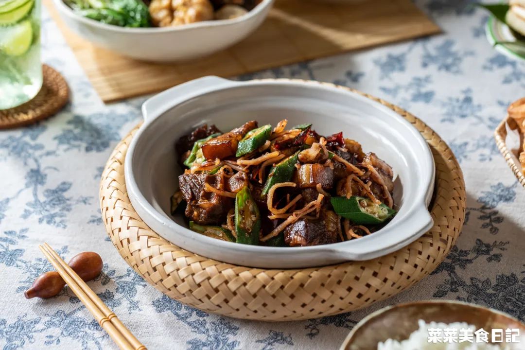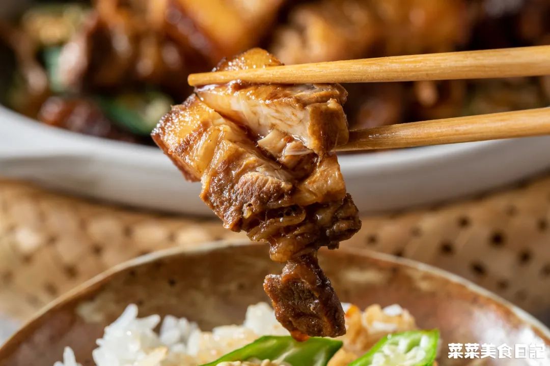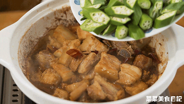 1小勺=1 tea spoon=5ml1.五花肉、软骨冷水入锅,加姜片焯烫,撇去浮沫,捞起洗净2.高压锅加入1.5L水、2头蒜、一个肉骨茶药材包煮沸腾,再加入五花肉、软骨、一个肉骨茶酱料包,大火上汽后转小火压15分钟普通锅具:蒜头、药材包煮10分钟,再加入酱料包和五花肉、软骨一起炖30分钟如果想额外吃肉骨茶,水加到2.5L,肉一共800g,炖完捞出一半炒,一半做汤4.干辣椒剪成小段、秋葵洗净去头尾切段、泡发鱿鱼剪成丝、蒜瓣剁碎5.小碗里加入1大勺黄酒、1大勺生抽、1大勺黑酱油、1.5大勺蚝油、1小勺糖、1小勺胡椒粉拌匀待用6.起锅热油小火煸香鱿鱼丝捞出,再加入干辣椒、蒜瓣炒香倒入五花肉、软骨、酱汁煎至上色,再加入半碗肉骨茶汤盖盖焖5分钟7.焖至酱汁浓稠,加入秋葵、鱿鱼丝继续翻炒均匀,焖2分钟出锅五花肉先在高压锅里压过,后续焖焗的时间压根不用长。