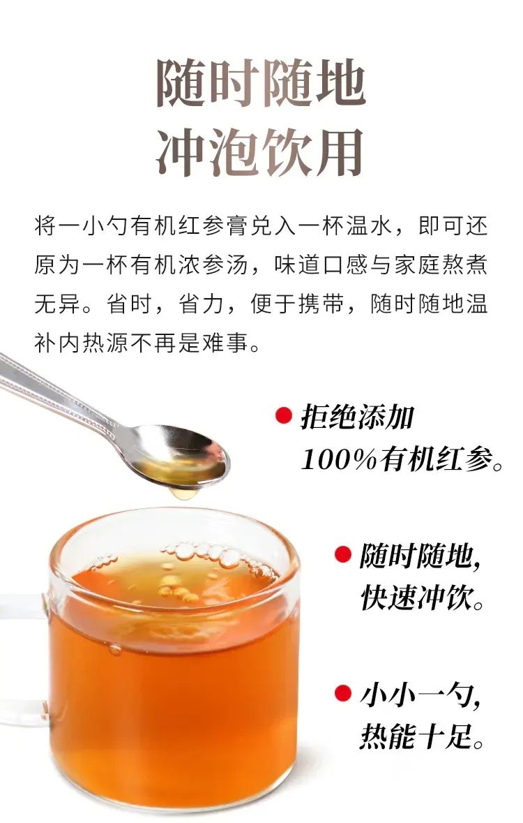 取一勺有机红参膏兑入温水,即可饮用,免熬煮,省时省力又省钱,随时温补内热源,真的很轻松!