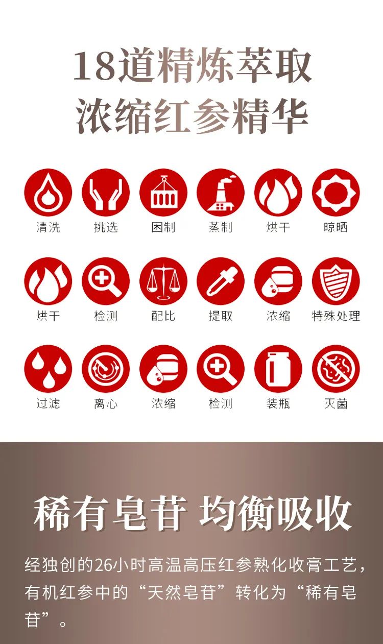 经18道标准化精炼萃取工艺精制而成的红参膏人参精萃,将稀有皂苷Rg3、Rg5和Rk1的含量分别提高了200倍、100倍和60倍,稀有人参皂苷总含量提高近1000倍。这样的红参膏人参精萃具备更多样更强大的生物功能。