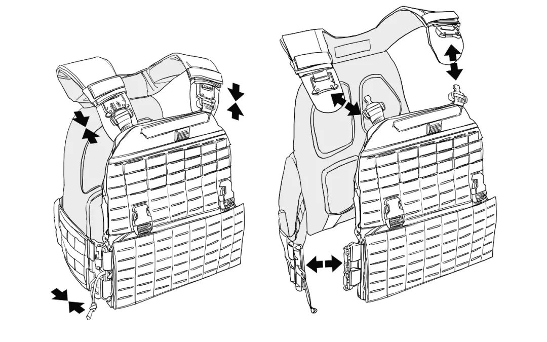 此款战术背心采用前后片侧开结构。通过肩胛两侧的金属蛇扣以及侧腰的军规快拆卡扣连接固定,以便在危机状况时(狭小空间通行、落水求生、受伤抢救等)实现快速脱卸,这点非常重要。虽然其它同类产品也大多有设计快拆功能,但是在非正常体态下(匍匐、仰卧、蜷曲等)或狭小空间中难以操作。「通用装甲」采用了两个腰部、两个肩部快拆设计,在紧急情况发生时只要可以打开其中任意一侧的两个扣便可以金蝉脱壳。