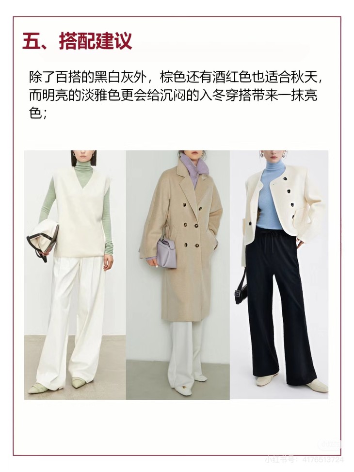除了百搭的黑白灰外,棕色还有酒红色也适合秋天,而明亮的淡雅色更会给沉闷的秋冬穿搭带来一抹亮色。