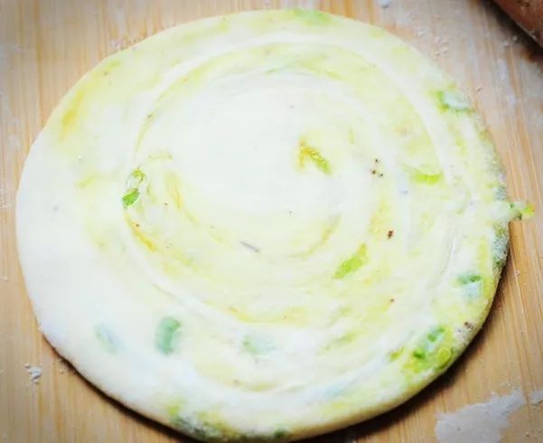 4、将两端抻一下,再从一端开始向中间卷起,擀成圆饼待用;