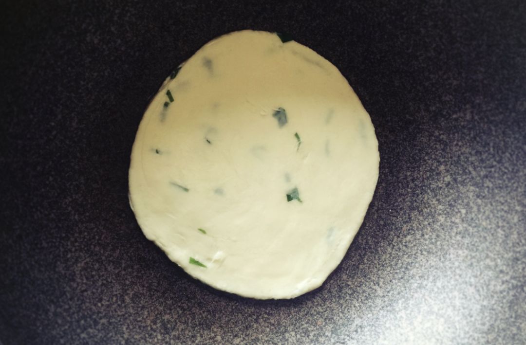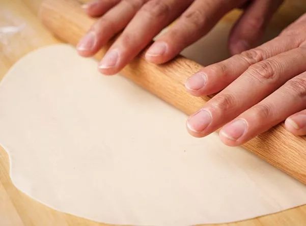2、将面挤子擀成薄薄的圆面片;