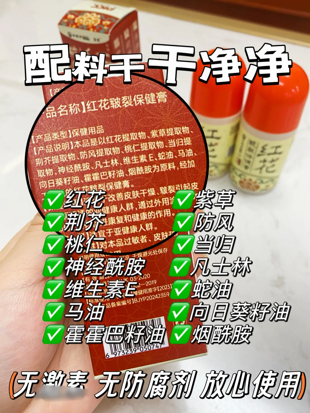 专门添加了红花、紫草、荆芥、防风、桃仁、当归这些草本精粹修护干裂。