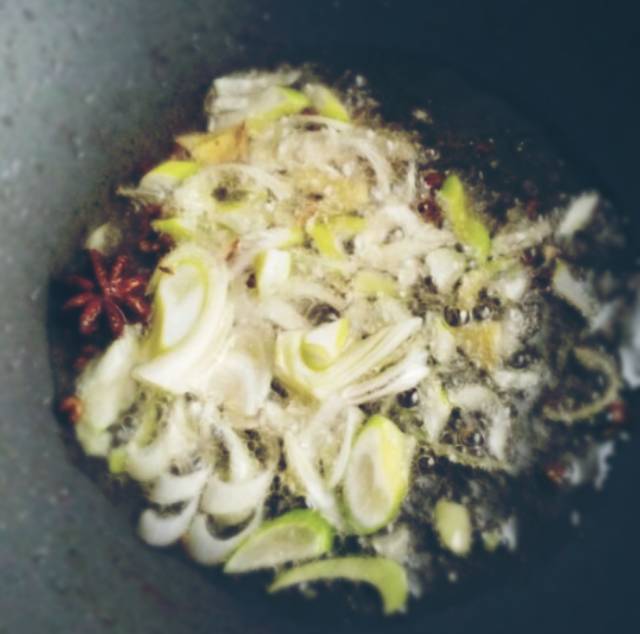 1、热锅凉油,放1个大料瓣,其颜色由棕红变黑,香气充分;