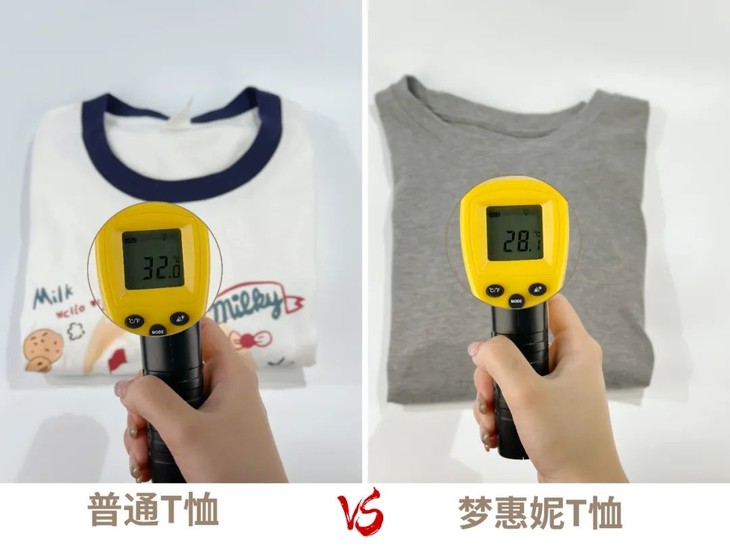 我们也特意测量了下它和普通纯棉T恤的表面温度,起码低了4°C+,凉而不冰!