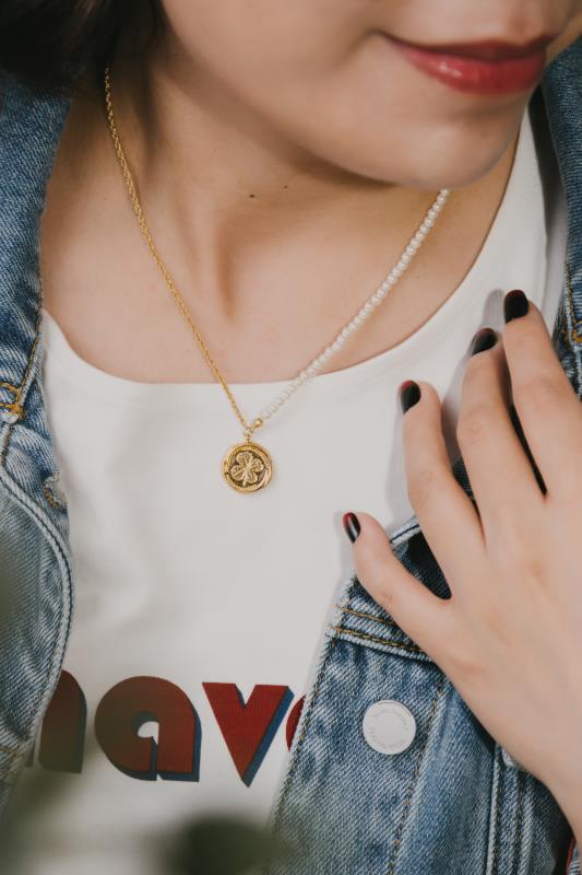 这款贝珠项链佩戴太显质感了~随意一戴就很时髦出众!还加入了寓意幸运的四叶草元素,在新的一年里让好运加倍~珍珠链条与金属链条的结合,以及复古金币的吊坠,美感都很在线!
