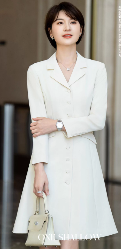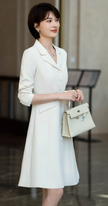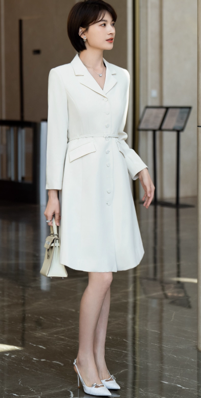 这款米白色西装连衣裙,是简约主义的时尚宣言。西装领的利落与裙摆的优雅碰撞,打造出极具辨识度的风格,让你在人群中脱颖而出。