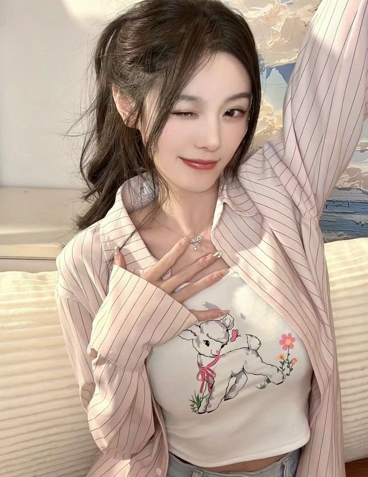 白色吊带搭配粉色条纹衬衣,再+蝶梦项链点缀~