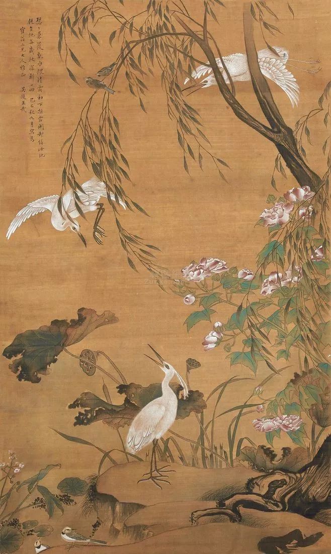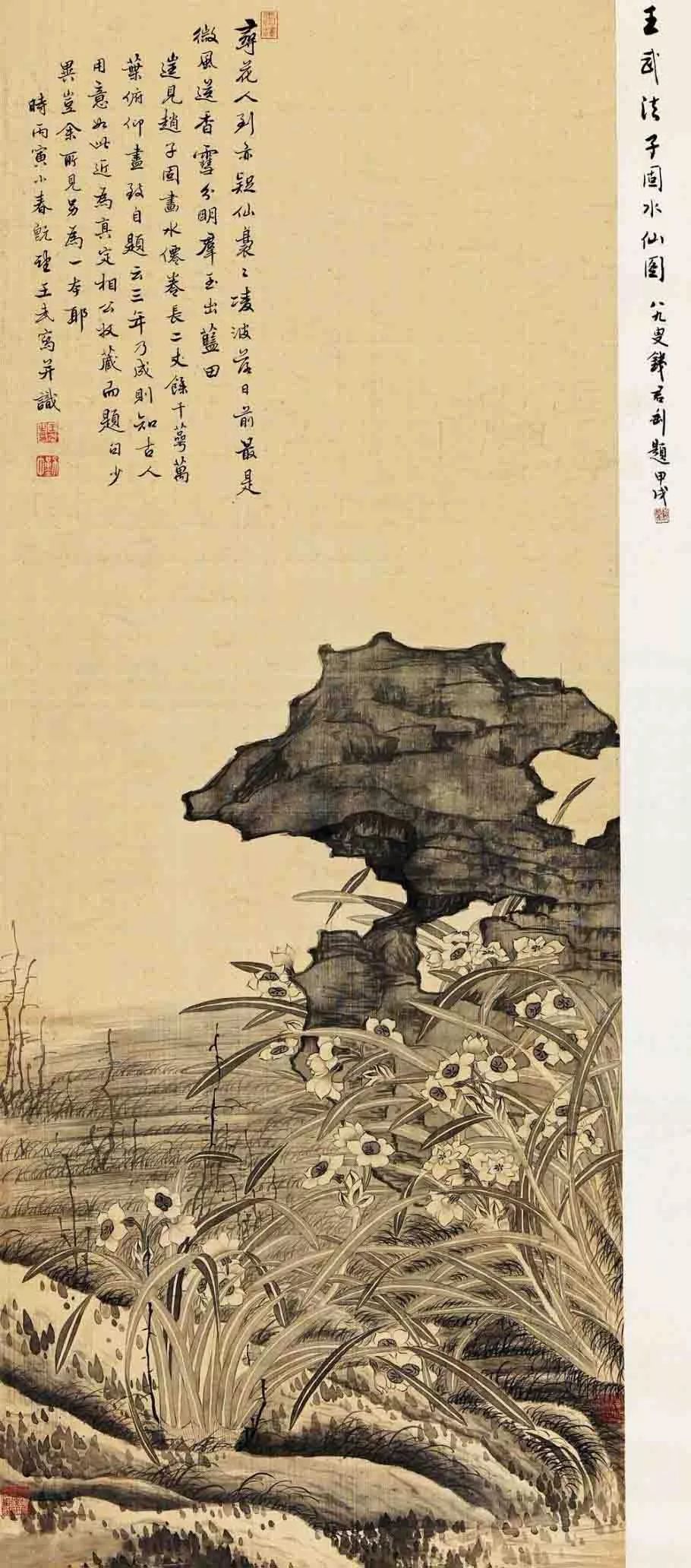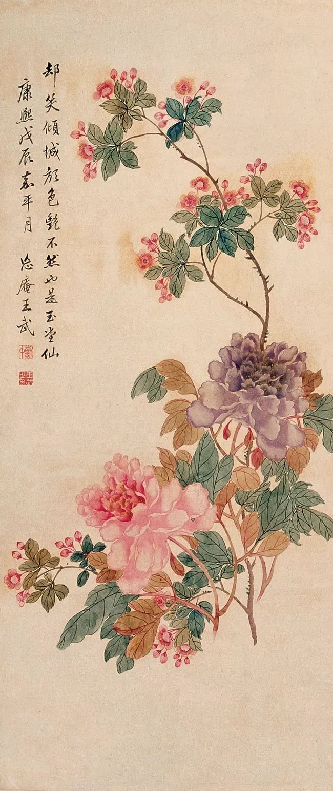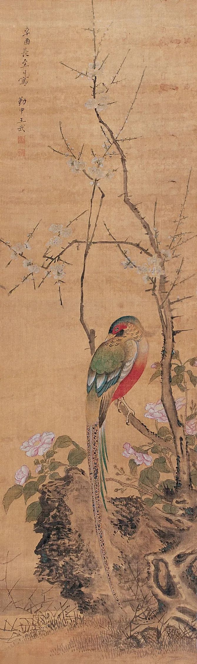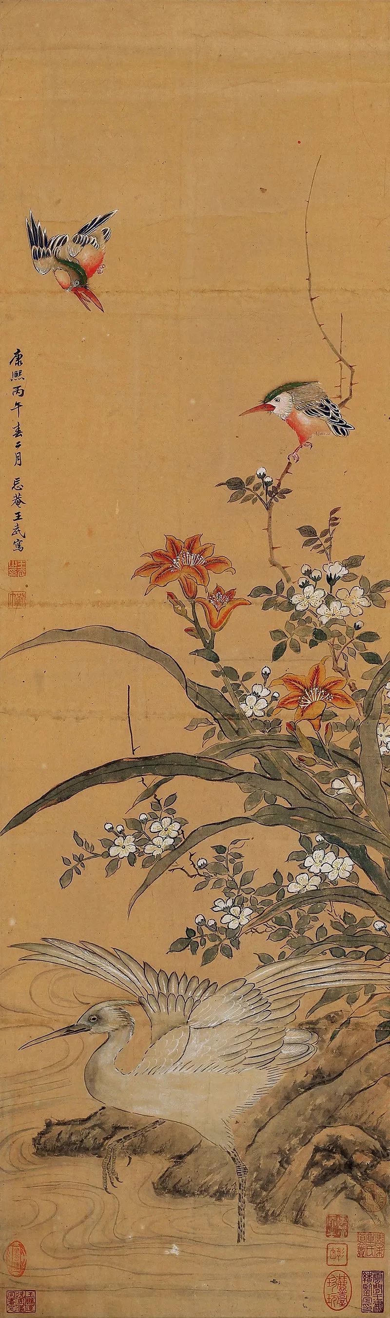 王武:(1632-1690年),字勤中,晚号忘庵,又号雪颠道人,如是翁、不山。吴县(今江苏苏州)人。清代画家,精于古玩鉴赏,而且收藏甚多。传世作品有《水仙柏石图》、《红杏白鸽图》、《鸳鸯白鹭图》等。