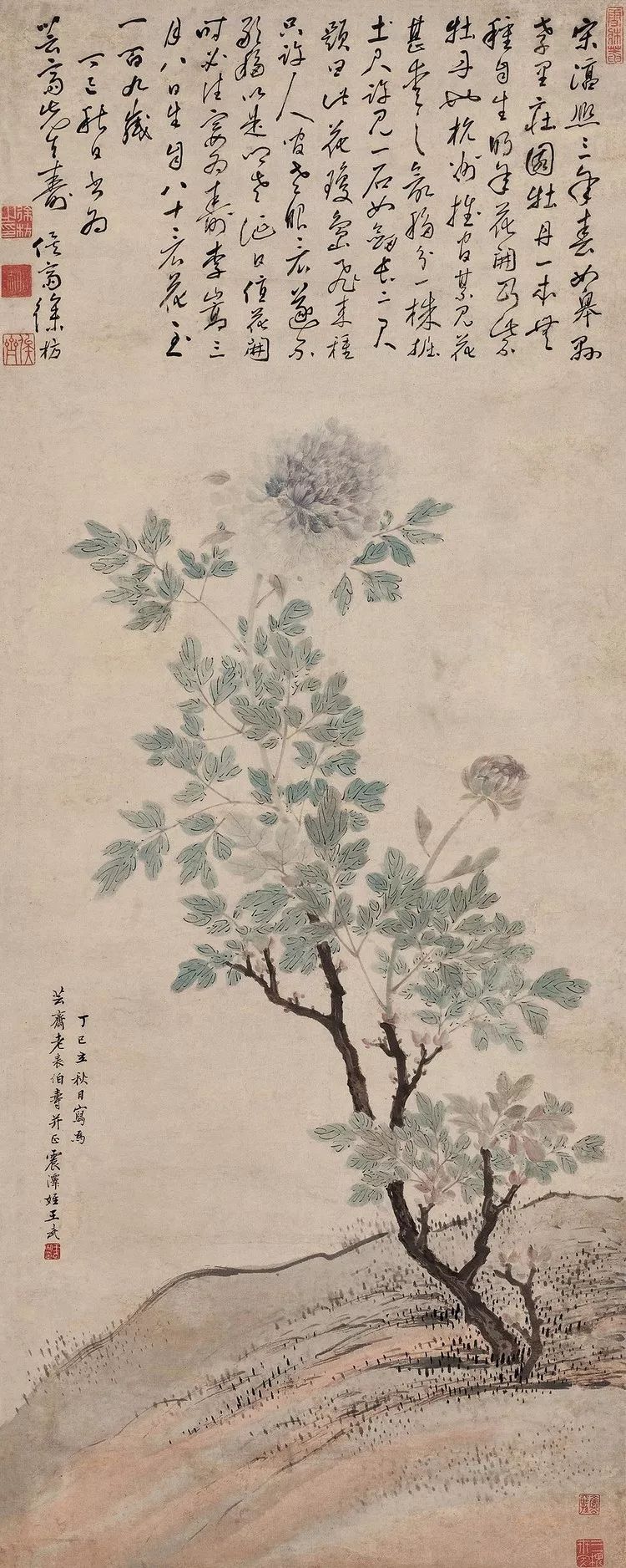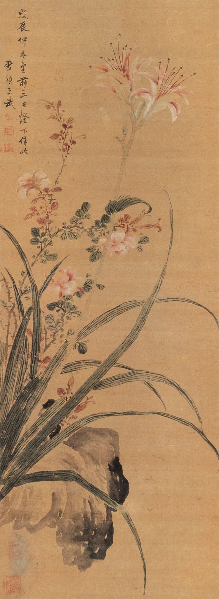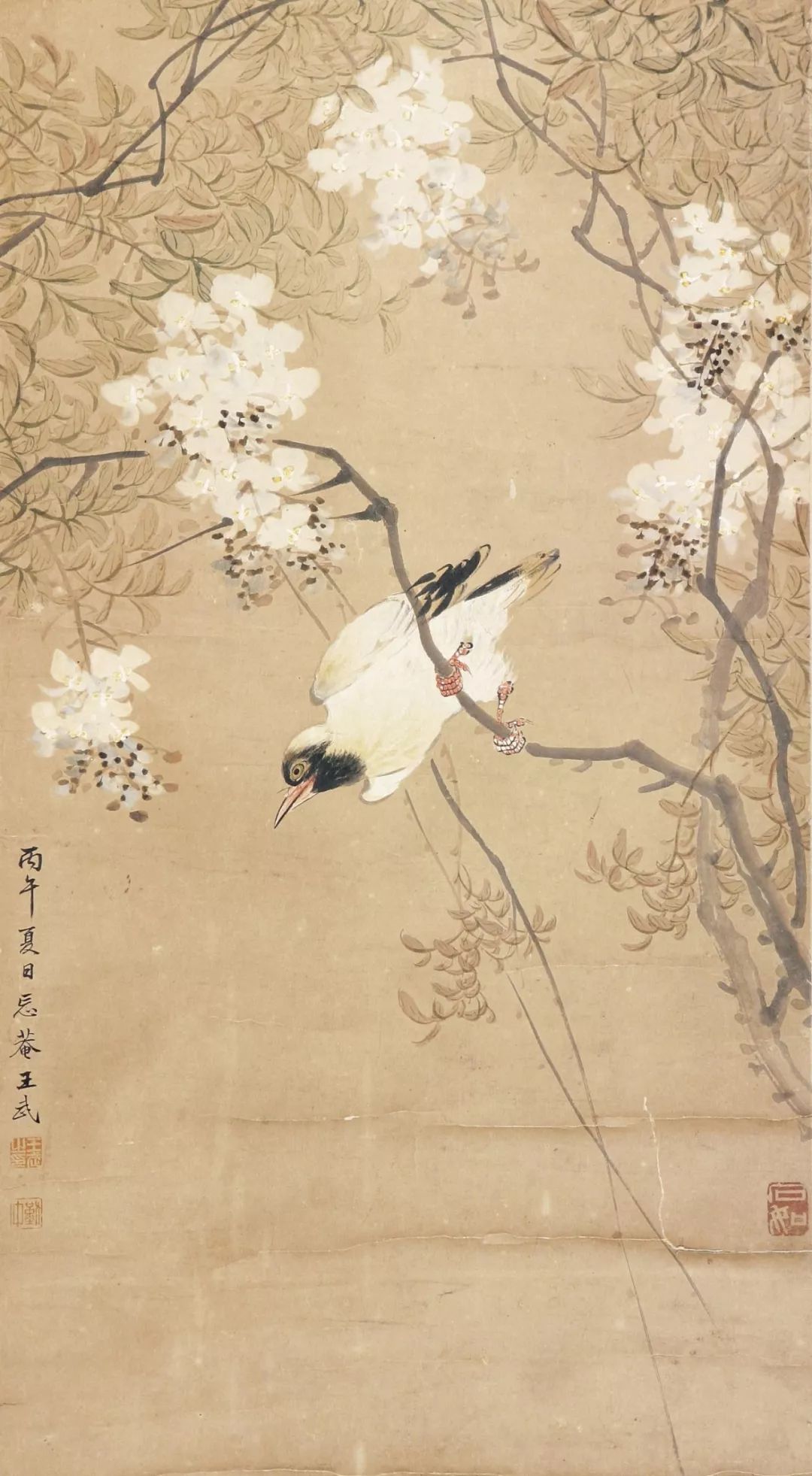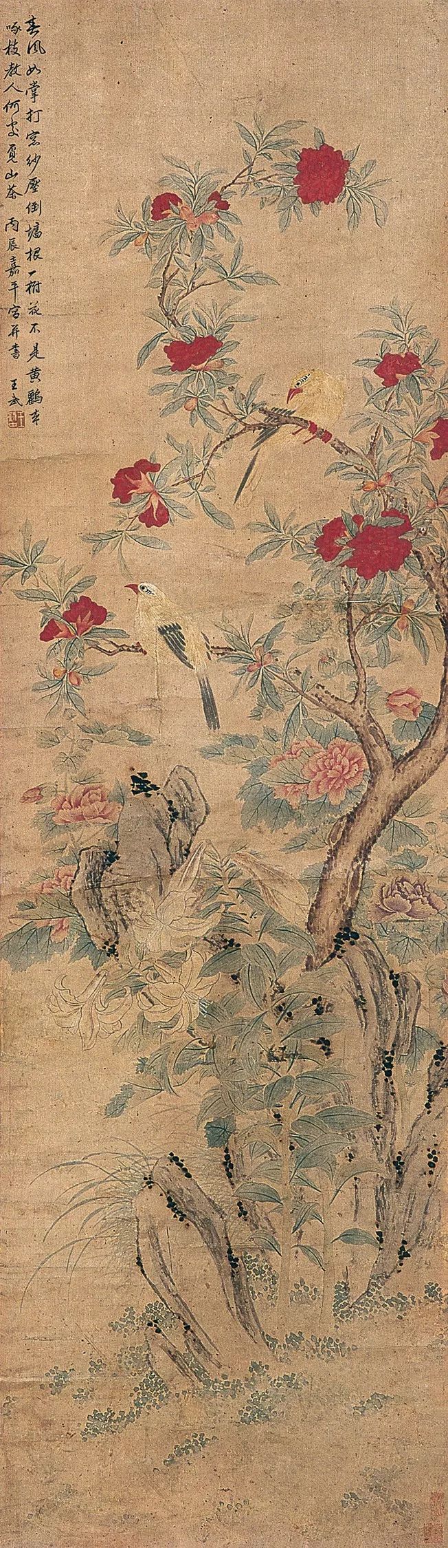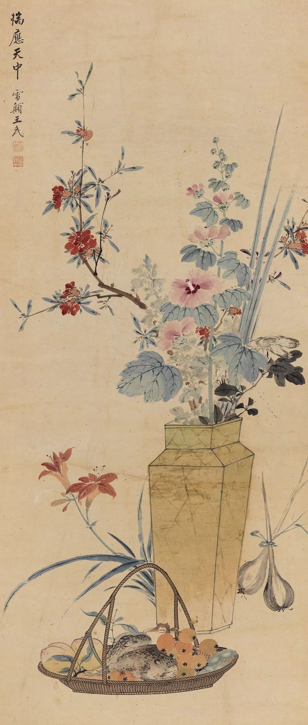 王武:(1632-1690年),字勤中,晚号忘庵,又号雪颠道人,如是翁、不山。吴县(今江苏苏州)人。清代画家,精于古玩鉴赏,而且收藏甚多。传世作品有《水仙柏石图》、《红杏白鸽图》、《鸳鸯白鹭图》等。