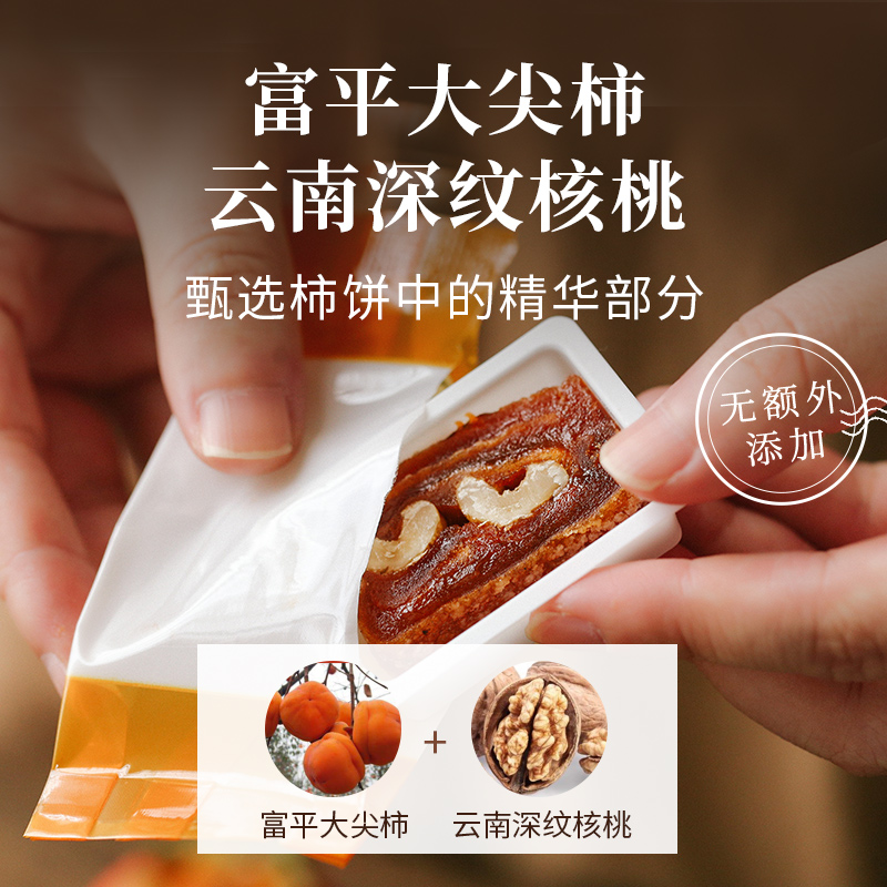 2.选用富平大尖柿,果色红润,果心通亮,软糯鲜甜。云南深纹核桃,壳纹较深,果仁呈浅白色,香气足