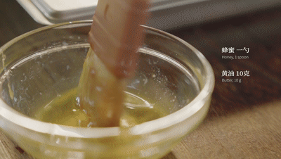 [4]用蒸烤箱自带的旋转烤叉固定好鸡肉,混合蜂蜜和黄油(隔热水化开)刷在鸡肉表面。